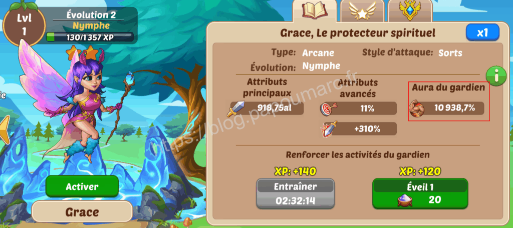 Ne pas négliger de monter vos gardiens, en effet que le gardien qu’il soit actif ou non, son aura par contre est activée et vous en bénéficiez, du coup le bonus de l’aura est toujours un vrai plus pour vous aider à monter les niveaux, comme c’est assez long de monter les gardiens, je vous conseille de monter rapidement dans l’arbre Firestone la compétence de l’entraineur et le talent associé qui porte le même nom.