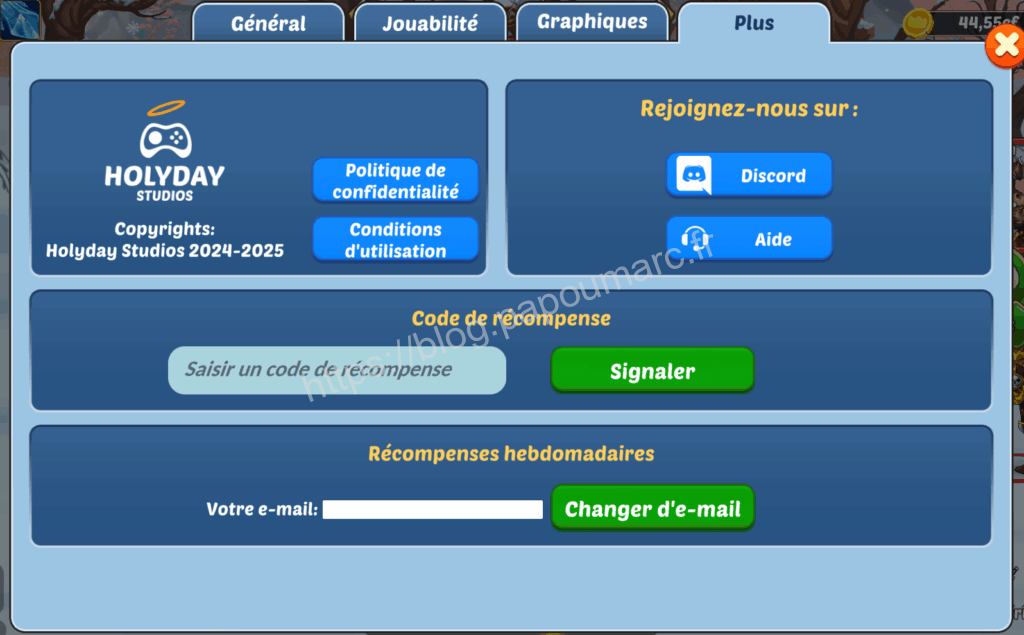 Il faudra dans le dernier onglet du panneau de configuration renseigner votre mail, cela vous permettra de recevoir, une fois par semaine, un petit code à renseigner pour obtenir des bonus. Attention les bonus sont aléatoire, il y a parfois des bonnes surprises.