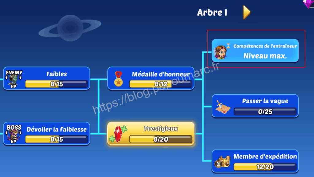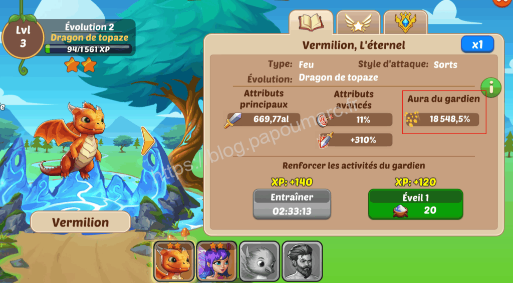 Ne pas négliger de monter vos gardiens, en effet que le gardien qu’il soit actif ou non, son aura par contre est activée et vous en bénéficiez, du coup le bonus de l’aura est toujours un vrai plus pour vous aider à monter les niveaux, comme c’est assez long de monter les gardiens, je vous conseille de monter rapidement dans l’arbre Firestone la compétence de l’entraineur et le talent associé qui porte le même nom.