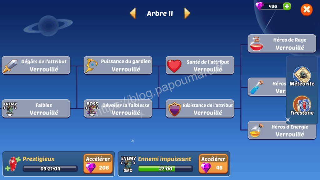 Si vous devez progresser, c’est carrément stratégique, il faut débloquer ce second espace, pour vous donner une idée, vous aurez une différence de 20 à 30 niveaux au bout de 2 semaines seulement, ce qui pourrait vite vous décourager. Elle se situe en bas à droite et s’achète avec 1500 météorites dans la recherche firestone. A ne surtout pas rater.