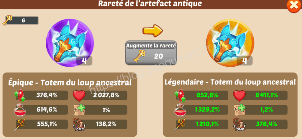 Il faut combiner l’enchantement et l’amélioration pour obtenir de bonnes statistiques. C’est là qu’il faut garder des clés (et non pas forcément pour les amulettes), car comme vous pouvez le voir, la rareté est significative dans le bonus qu’apporte un artéfact.